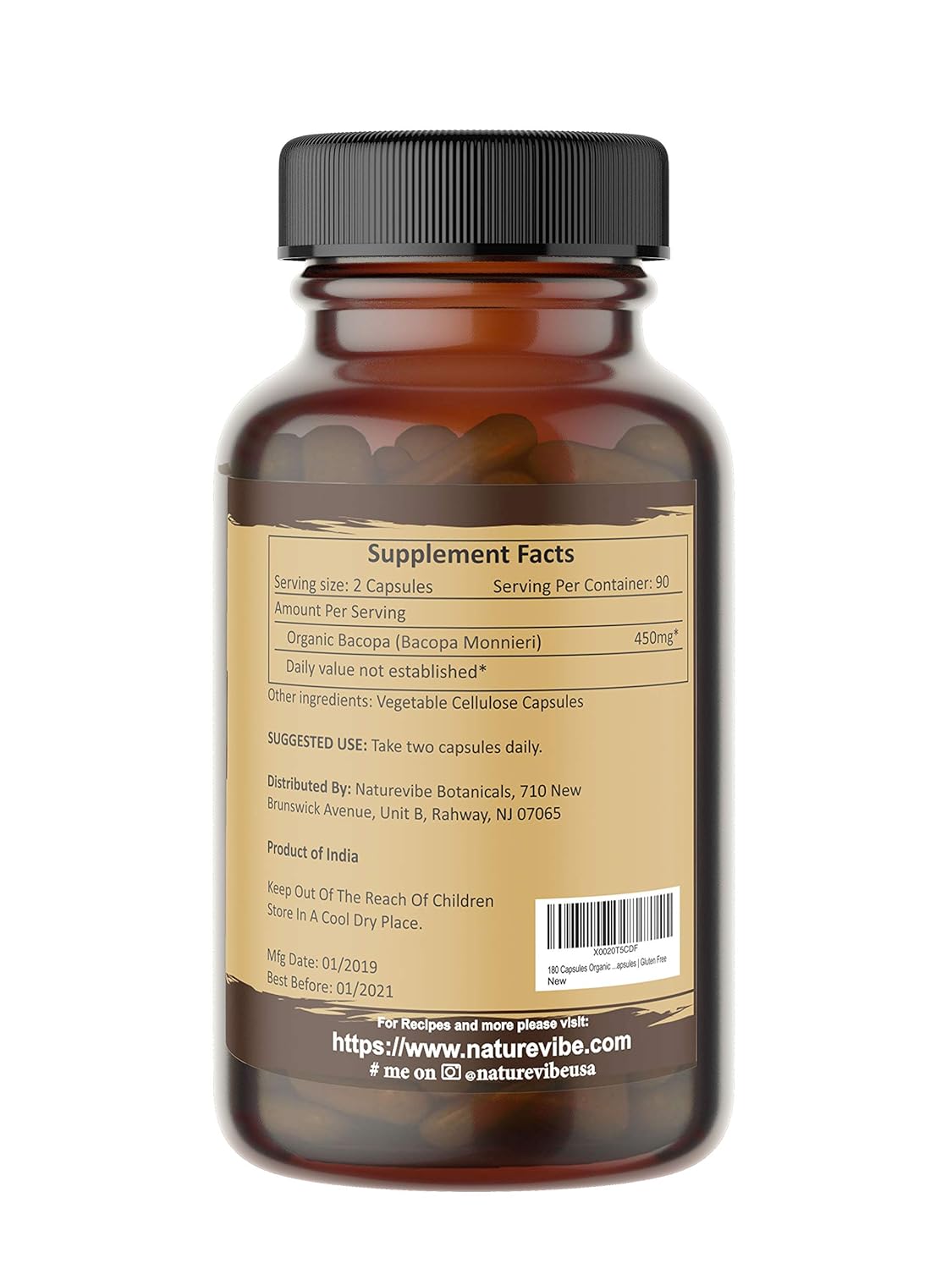 Naturevibe Botanicals 180 Bacopa Monnieri Brahmi Capsules 100 Organic Bacopa